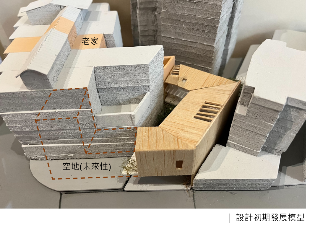 在「活力」面向,建築配置延續了與老家的線性關係與未來購買鄰地發展的可能,一樓保留半戶外聚會空間作為兩代家庭的生活區隔與情感連結。面對狹窄巷弄,設計團隊將二樓量體向街道延伸,形成的陰影與開放空間為行人提供遮陽避雨的友善空間,讓入口成為鄰里間可辨識的節點。內部中庭則透過低尺度水平開窗與綠化植栽,在確保採光通風的同時,巧妙化解與鄰房對視的隱私問題,也保有對鄰居們的善意。