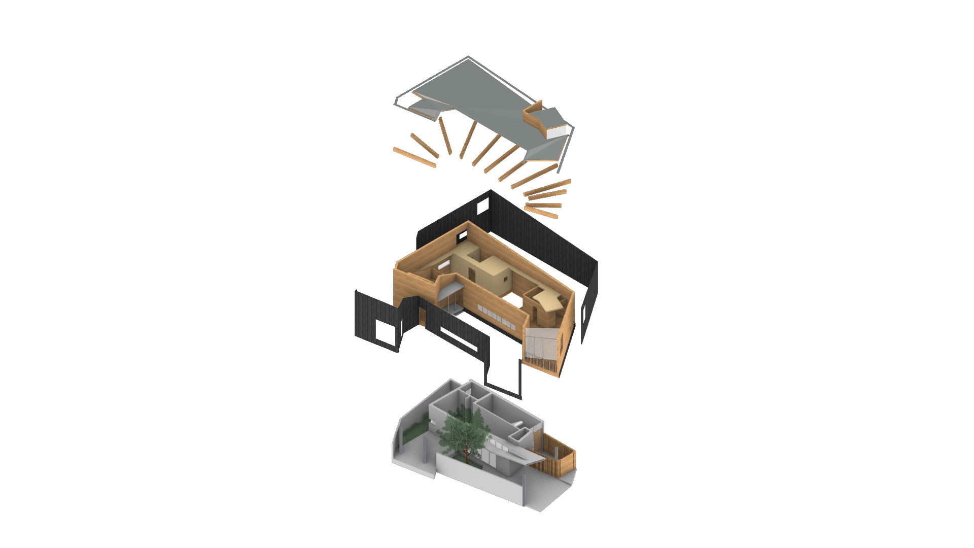 作為「新木都」的實踐,本案採RC與木構的混合構造。一樓以混凝土回應防潮需求,二樓則全面採用木構系統。室內更積極運用國產材於隔間與裝修,讓木材不只是結構,更轉化為溫潤的生活觸感。